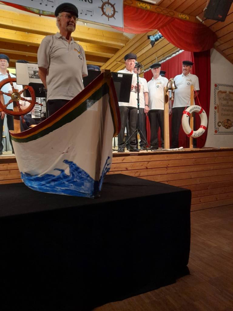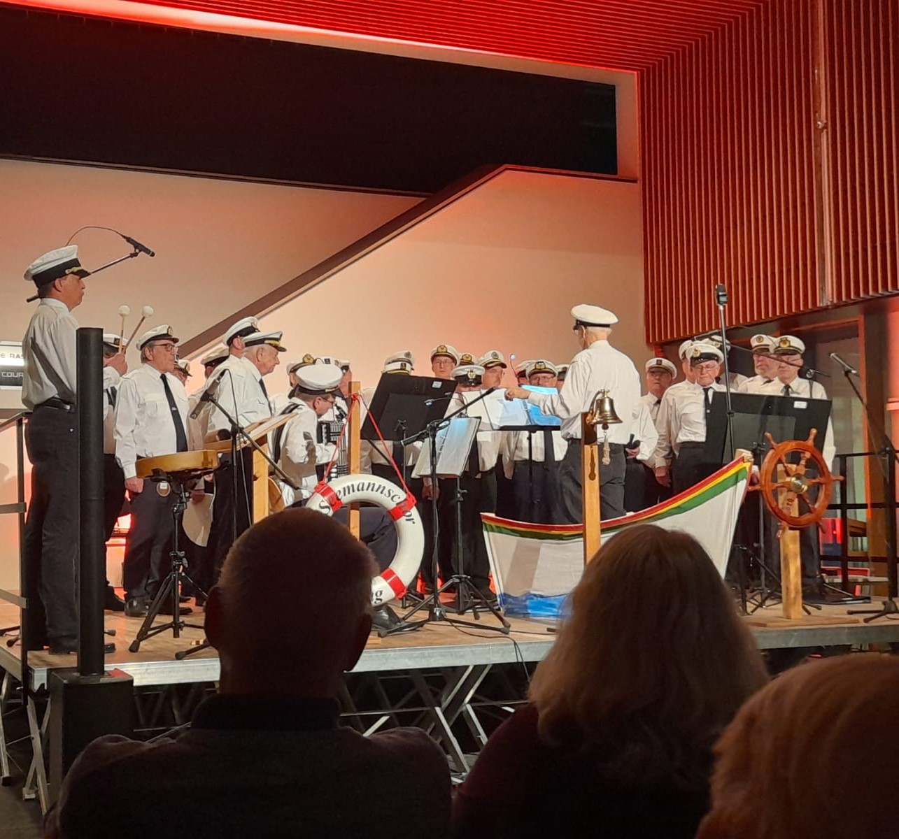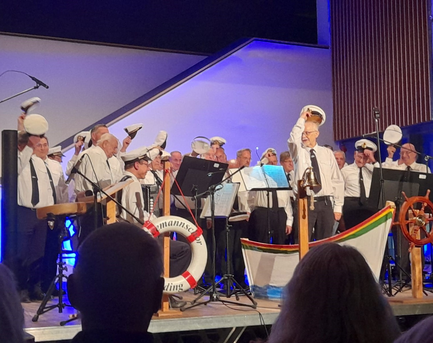 Wer aber glaubt, die Lieder würden nur einfach so die Strophen entlang gesungen, der irrt! Voller Leidenschaft und reichlich guter Laune brachte jede der Stimmen eine mitreißende Passion auf die Bühne. Der herrliche Gesang der anwesenden 29 Chorsänger war unter der Leitung ihres Dirigenten Hans Richter im gesamten Raum zu hören. Die Stimmung auf der Bühne – eine Wonne. Von Lied zu Lied gab es ein kleines erzählerisches Schmankerl. Anschließend folgte der Gesang, der mit Charme auf den Weg durch die Strophen nahm. Eine Ukulele mitsamt hawaiianischen Flair sowie ein Megaphon mit Urlaubsfeeling, ein aufsteigender lächelnder Mond und ein Paukenschlag rundeten die Faszination ab, die auf der Bühne auftrat. Nach Abschluss des eigentlich letzten Liedes war das fordernde Rufen nach Zugaben sehr laut. Mit drei weiteren Zugaben kam der Seemannschor dem Willen der Passagiere entgegen. Wie man sagt: Die Zeit vergeht immer viel zu schnell, wenn es sehr schön ist. Und so war es auch an diesem Abend. Als der Herrenchor schließlich mit den Hüten wedelte und sich von der Bühne verabschiedete, fühlte es sich so an, als würde man einem Vergnügungspark, in dem man sehr viel Spaß hatte, schweren Herzens am Ende des Tages den Rücken zu kehren. Aber Trost gab es dennoch: Wer es bis zum nächsten Konzert kaum aushalten würde, der konnte eine der CDs des Chors vor Ort erwerben. Und nicht traurig sein: Das nächste Konzert kommt bald!