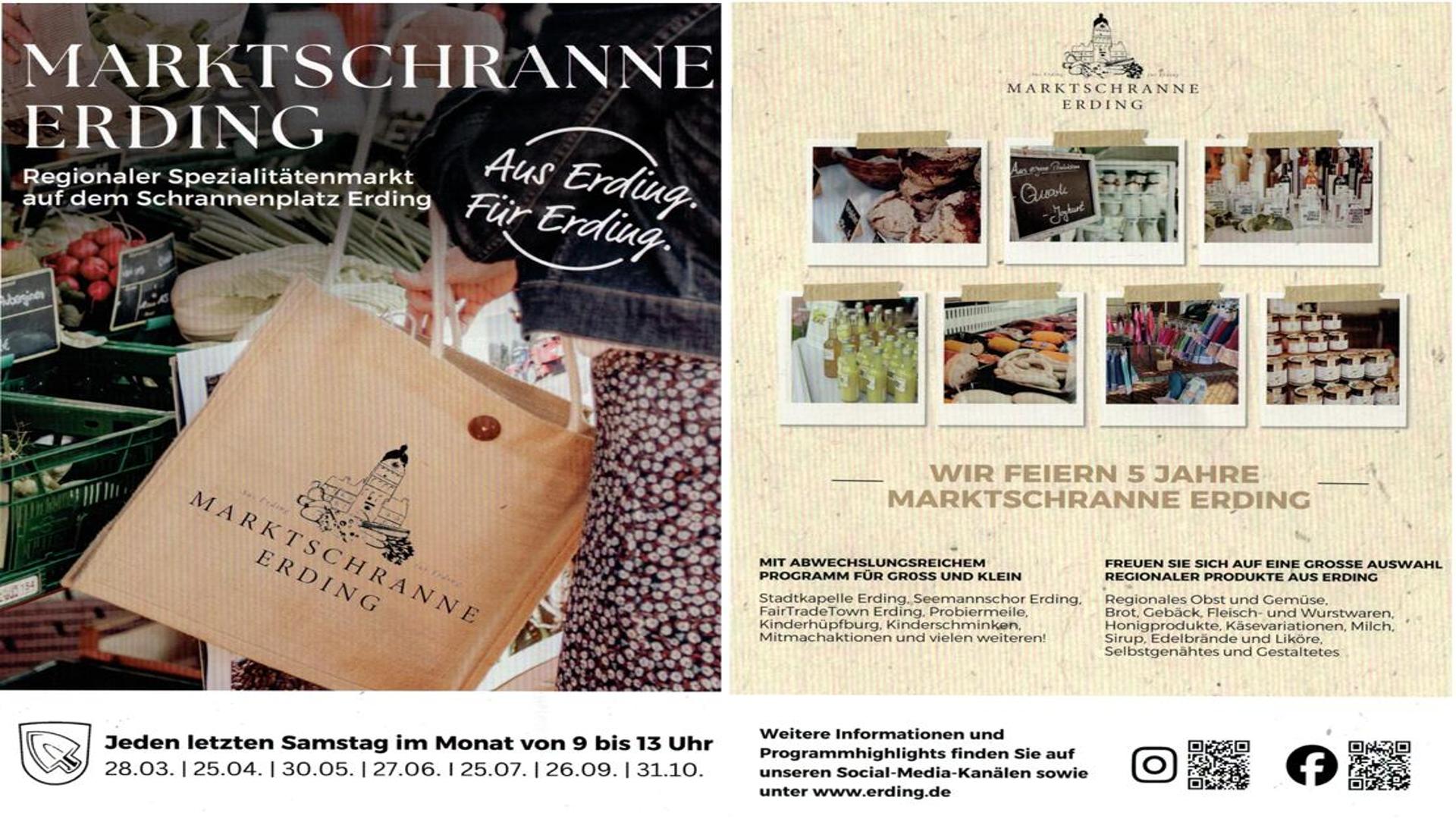 Wir laden euch alle recht herzlich zur Marktschranne der Stadt Erding am Samstag den 30.05.2026 ein. Wir werden von zwischen 10:00 Uhr und 12:00 Uhr zwischen Schrannenplatz und kleinem Platz auftreten. Der Markt bietet viele Einkaufsmöglichkeiten und kulinarische Highlights.